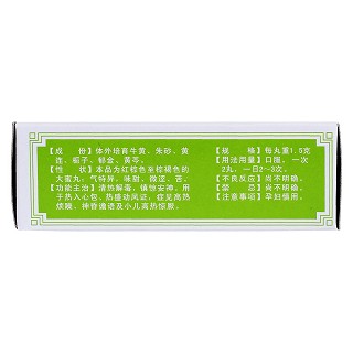 | 主要原料 | 体外培育牛黄、朱砂、黄连、黄芩、栀子、郁金。 |