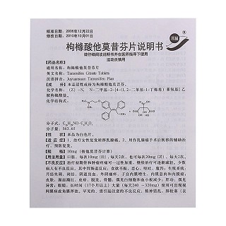 | 主要原料 | 本品主要成份为枸橼酸他莫昔芬。化学名称:(Z)-N,N-二甲基-2-[4-(1,2-二苯基-1-丁烯基)]苯氧基-乙胺枸橼酸盐。 |