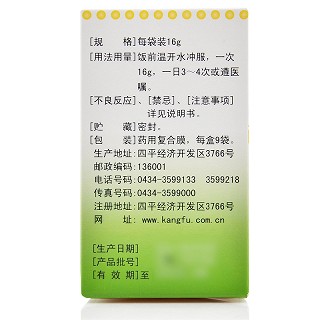 | 用法用量 | 饭前温开水冲服,一次16g。一日3~4次或遵医嘱。 |