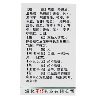 | 主要原料 | 陈皮、哈蟆油、鹿角胶、乌梢蛇(去头,炒)、紫河车、鸡蛋黄油、桔梗、龟甲胶、百部、浙贝母、红参、白及、黄精、茯苓、蛤蚧(去头、足)、麦冬、核桃仁、当归。 |