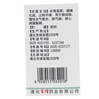 | 主要作用 | 补肾益肺,健脾化痰,止咳平喘,用于肺结核,慢性支气管炎,肺气肿,肺心病缓解期。 |