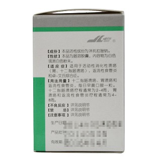 | 注意事项 | 1.大剂量使用可出现心律不齐,转氨酶增高,肾功能改变,粒细胞降低等。 2.本品为肠溶制剂服用时请勿咀嚼。 3.当怀疑胃溃疡时,应首先排除癌症的可能性。因为本品治疗可减轻其症状,从而延误诊断。 4.本品儿童用药的疗效及安全性资料尚未建立。 5.肝肾功能不全者慎用。 |
