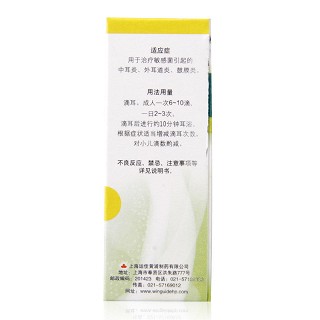 | 注意事项 | 1.只用于点耳。 2.本品一般适用于中耳炎局限在中耳粘膜部位的局部治疗。若炎症已漫及鼓室周围时,除局部治疗外,应同时服用口服制剂。 3.使用本品时若药温过低,可能会引起眩晕。因此,使用温度应接近体温。 4.出现过敏症状时应立即停药。 5.使用本品的疗程以4周为限。若继续给药时,应慎用。 |