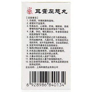 | 注意事项 | 1、忌烟酒、辛辣刺激性食物。 2、感冒时不宜服用。 3、有高血压、心脏病、肝病、糖尿病、肾病等慢性病严重者应在医师指导下服用。 4、儿童、孕妇、哺乳期妇女、年老体弱者应在医师指导下服用。 5、本品只用于肝肾阴虚证之听力逐渐减退,耳鸣如蝉声者,凡属外耳、中耳病变而出现的耳鸣,如外耳道异物等,应去医院就诊。 6、突发耳鸣耳聋者应去医院就诊。 7、服药2周症状无缓解,应去医院就诊。 8、对本品过敏者禁用,过敏体质者慎用。 9、本品性状发生改变时禁止使用。 10、儿童必须在成人监护下使用。 11、请将本品放在儿童不能接触的地方。 12、如正在使用其他药品,使用本品前请咨询医师或药师。 |