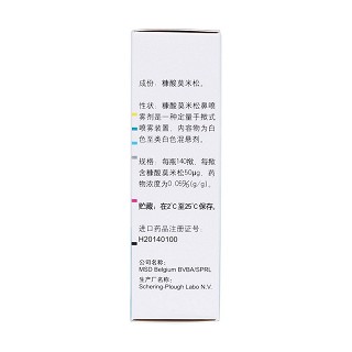 | 用法用量 | 季节过敏性或常年性鼻炎 通常先手揿喷雾器6-7次作为启动,直至看到均匀的喷雾,然后鼻腔给药,每喷喷出糠酸莫米松混悬液约100mg,内含糠酸莫米松一水合物,相当于糠酸莫米松50μg,如果喷雾器停用14日或14日以上,则在下一次应用时应重新启动。 在每次用药前充分振摇容器。 成人(包括老年患者)和青年:用于预防和治疗的常用推荐量为每侧鼻孔2 喷(每喷为50μg),一日1 次(总量为200μg),一旦症状被控制后,剂量可减至每侧鼻孔1喷(总量100μg),即能维持疗效。 如果症状未被有效控制,可增剂量至每侧鼻孔4 喷的最大日剂量,一日1次(总量400μg),在症状控制后减小剂量。 在首次给药后12 小时即能产生明显的临床效果。 3 至11 岁儿童:常用推荐量为每侧鼻孔1 喷(每喷为50μg),一日1 次(总量为100μg)。 |