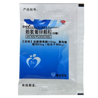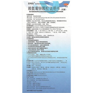 | 主要原料 | 本品为复方制剂,每包含赖氨酸125毫克,葡萄糖酸锌35毫克(相当于锌5毫克)。 辅料为:枸橼酸、蔗糖、柠檬黄。 |
