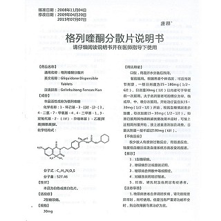 用法用量 | 餐前服用。根据患者个体情况,可适当调节剂量,一般日剂量为15~180mg。日剂量30mg以内者可于早餐前一次服用。大于此剂量者可酌情分为早、晚或早、中、晚分次服用。开始治疗量应从15~30mg开始,根据血糖情况逐步加量,每次加量15~30mg。如原已服用其他磺酰脲类药改用本品时,可按相同量开始,按上述量逐渐加量调整。日最大剂量一般不超过180mg。 |