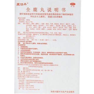 | 主要原料 | 全鹿干、锁阳(酒炒)、菟丝子、枸杞子(盐水炒)、肉苁蓉、党参、白术(炒)、当归(酒炒)、麦冬、沉香、炙甘草等味。 |
