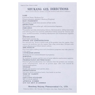 | 用法用量 | 外用。一次5克,一日1次,睡前将舒康凝胶剂瓶颈插入阴道,用手指挤压瓶体,将药液挤入阴道深处。七天为一疗程。 |