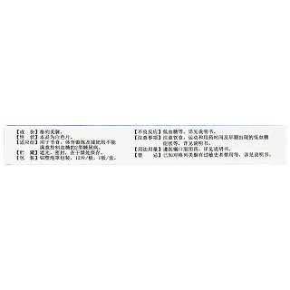 | 不良反应 | 1、低血糖,本品可引起低血糖症,尤其老年体弱患者在治疗初期,不规则进食,饮酒及肝肾功能损害患者,据报道,发生率为2%。 2、消化系统症状:恶心呕吐,腹泻、腹痛少见。 3、有个别病例报道血清肝脏转氨酶升高。 4、皮肤过敏反应,瘙痒、红斑、荨麻疹少见。 5、其他:头痛、乏力、头晕少见。 |