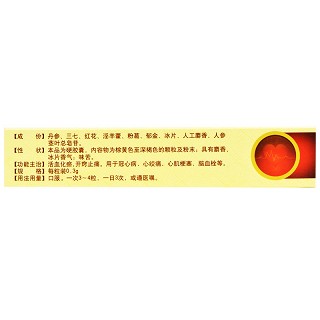 | 主要原料 | 丹参、三七、红花、淫羊藿、葛根、郁金、冰片、人工麝香、人参茎叶总皂苷。 |