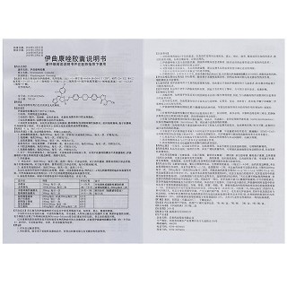 | 不良反应 | 已报告的伊曲康唑的不良反应中常见胃肠道不适,如厌食、恶心,腹痛和便秘。少见的副作用包括头痛、可逆性肝酶升高、月经紊乱,头晕和过敏反应(如瘙痒、红斑、风团和血管性水肿)。有个例报告出现了外周神经病变和Stevens-Johnson综合症(重症多形红斑),但后者的原因不明。已有重要的潜在病理改变并同时接受多种药物治疗的大多数患者,在接受伊曲康唑胶囊长疗程疗程(约一个月以上)治疗时,可见低血钾症、水肿、肝炎和脱发等症状。 |