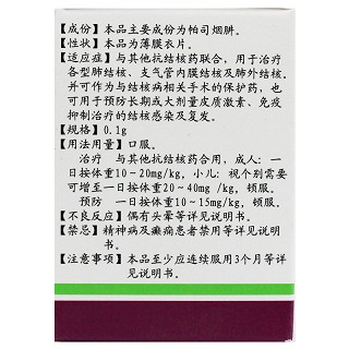 | 用法用量 | 口服。治疗 与其他抗结核药合用, 成人:一日按体重10-20mg/kg (一日6~12片), 小儿:视个别需要可增至一日按体重20~40mg/kg(一日3~6片),分3次口服或顿服。 预防 每日按体重10-15mg/kg,分3次口服或顿服。 |