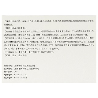 | 用法用量 | 口服每日50mg,共5日。自月经周期的第5天开始服药。若患者系闭经,则应先用黄体酮撤退性出血的第5天始服用。患者在治疗后有排卵但未受孕可重复原治疗的疗程,直到受孕,或重复3~4个疗程。若患者在治疗后无排卵,在下一次的疗程中剂量可增加到每日100mg,共5日。个别患者药量可达每天150mg时,才能排卵。 |