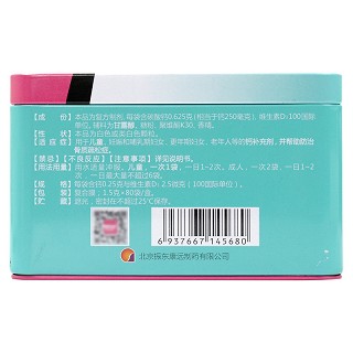 | 注意事项 | 1.心肾功能不全者慎用。2.尿钙或血钙浓度过高者禁用。3.洋地黄化病人禁用。4.当药品性状发生改变时禁止服用。5.儿童必须在成人监护下使用。6.请将此药品放在儿童不能接触的地方 |