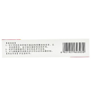 | 主要作用 | 适用于单用饮食和运动治疗不能获良好控制的2型糖尿病患者。本品可单独用药,也可与磺脲类或胰岛素合用。 |