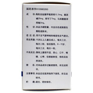 | 主要原料 | 本品为复方制剂,其组份为每粒含:盐酸甲氧那明12.5mg、氨茶碱25mg、那可丁7mg、马来酸氯苯那敏2mg。 |