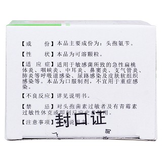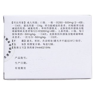 | 用法用量 | 成人剂量:口服,一般一次0.25~0.5g(2~4袋),一日4次,最高剂量一日4g(32袋)。肾功能减退的患者,应根据肾功能减退的程度,减量用药。单纯性膀胱炎、皮肤软组织感染及链球菌咽峡炎患者每12小时 0.5g(4袋)。 儿童剂量:口服,按体重一次6.25~12.5mg/kg,每6小时1次。 皮肤软组织感染及链球菌咽峡炎患者,一次12.5~50mg/kg,一日2次。 |