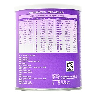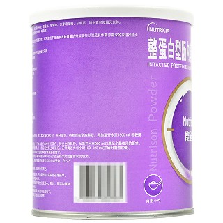 用法用量 | 口服或管饲喂养。 在洁净的容器中注入500ml温开水,加入本品1听(320g),充分混合。待粉剂完全溶解后,再加温开水至1500ml,轻轻搅拌混匀。也可用所附的小匙,取9平匙,溶于50ml温开水中充分混合,待完全溶解后,加温开水至200ml以满足少量使用的要求。管饲喂养时,先置一根喂养管到胃、十二指肠或空肠上端部分。正常滴速为每小时100-125ml(开始时滴速宜慢)。一般病人,每天给予2000kcal即可满足机体对营养成份的需求。高代谢病人(烧伤、多发性创伤),每天可用到4000kcal以适应机体对能量需求的增加。对初次胃肠道喂养的病人,初始剂量最好从每天1000kcal开始,在2-3天内逐渐增加至需要量。剂量和使用方法根据病人需要,由医师处方而定。 |