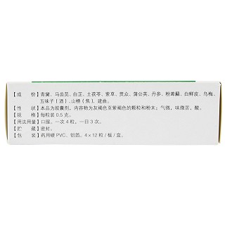 | 主要原料 | 青黛、马齿苋、白芷、土茯苓、紫草、贯众、蒲公英、丹参、粉萆薢、白鲜皮、乌梅、五味子(酒制)、山楂(焦)、建曲。 |