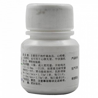 | 用法用量 | 口服。成人常用量:开始每次6.25~12.5mg ,一日两次,按需要及耐受量渐增至 50~200mg 。肾功能损害时,肌酐清除率小于 15ml/ ( min-1.73m2 )者,每日 25mg ;15~35ml/ ( min-1.73m2 )者,每日最多 50mg 。或遵医嘱。 |