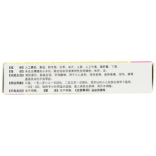 | 主要原料 | 人工麝香,黄连,羚羊角,甘草,冰片,人参,人工牛黄,猪胆膏,丁香。 |
