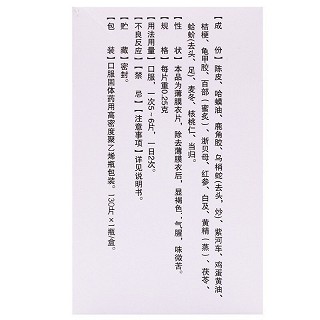 | 主要原料 | 陈皮、哈螟油、鹿角胶、乌梢蛇(去头,炒)、紫河车、鸡蛋黄油、桔梗、龟甲胶、百部、浙贝母、红参、白及、黄精、茯苓、蛤蚧(去头、足)、麦冬、核桃仁、当归。 |