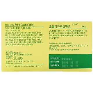 用法用量 | 每日一次。哮喘病人应在睡前服用。季节性过敏性鼻炎病人可根据自身的情况在需要时间服药。同时患有哮喘和季节性过敏性鼻炎的病人应每晚用药一次。15岁及15岁以上患有哮喘和/或季节性过敏性鼻炎的成人患者每日一次,每次10mg。6至14岁哮喘和/或季节性过敏性鼻炎儿童患者每日一次,每次5mg。2至5岁哮喘和/或季节性过敏性鼻炎儿童患者每日一次,每次4mg。一般建议:以哮喘控制指标来评价治疗效果,本品的疗效在用药一天内即出现。本品可与食物同服或另服。应建议患者无论在哮喘控制还是恶化阶段都坚持服用。对肾功能不全患者、轻至中度肝损害的患者及不同性别的患者无需调整剂量。本品与其它治疗哮喘药物的关系:本品可加入患者现有的治疗方案中。减少合并用药物的剂量:1.支气管扩张剂:单用支气管扩张剂不能有效控制的哮喘患者,可在治疗方案中加入本品,一旦有临床治疗反应(一般出现在首剂用药后),根据患者的耐受情况,可将支气管扩张剂剂量减少。2.吸入皮质类固醇 :对接受吸入皮质类固醇治疗的哮喘患者加用本品后,可根据患者的耐受情况适当减少皮质类固醇的剂量。应在医疗监护下逐渐减量。某些患者可逐渐减量直至完全停用吸入皮质类固醇。但不应当用本品突然取代吸入皮质类固醇或遵医嘱。 |