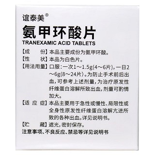 | 不良反应 | 本品副作用较氨基己酸为少。偶有药物过量所致颅内血栓形成和出血。 副作用尚有腹泻、恶心及呕吐;较少见的有经期不适(经期血液凝固所致)。必须持续应用本品较久者,应作眼科检查监护(例如视力测验、视觉、视野和眼底)。 |