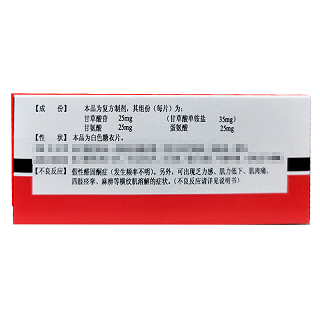 | 主要原料 | 本品为复方制剂,其组份(每片)为: 甘草酸苷(Glycyrrhizin) 25mg (甘草酸单铵盐Monoammonium Glycyrrhizinate 35mg) 甘氨酸(Glycynhizin) 25mg DL-蛋氨酸(DL-Methionine) 25mg |