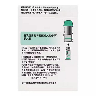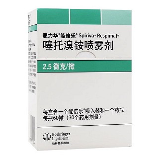 | 用法用量 | 本品只能吸入使用。药瓶只能插入能倍乐吸入器中,并通过能倍乐吸入器吸入使用(参见用药说明)。 一个药用剂量包含从能倍乐吸入器喷出的2揿。 成人的推荐剂量是噻托铵5µg,每日1次,每次吸入2揿,每日在相同的时间通过能倍乐吸入器吸入。 不应超过推荐剂量使用本品。 特殊人群: 老年患者可以按推荐剂量使用本品。 伴有肾功能不全的患者也可以按推荐剂量使用本品。然而,与所有其他主要经肾脏排泄的药物一样,对伴有中度到重度肾功能不全的患者(肌酐清除率≤50ml/分钟),应对本品的使用予以密切监测(参见【注意事项】)。 伴有肝功能不全的患者可以按推荐剂量使用本品(参见【药代动力学】)。 COPD通常不发生于儿童。(其他详见说明书) |